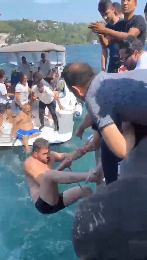 Görüntülerde ayrıca, teknenin yaklaşarak boğulma tehlikesi geçiren adamı alması, boğulma tehlikesi geçiren adamı kurtarmak için suya atlayan vatandaşın sudan çıktığı anda alkışlarla karşılanması yer alıyor. (DHA)