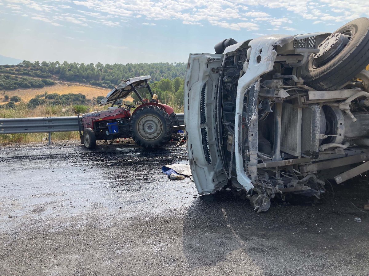 Kamyon, 300 metre kadar traktörü önünde sürükledi. Kazada, traktördeki yolculardan Nahide Kahraman hayatını kaybederken, sürücü Ragıp Kahraman (45) ve çocukları Doğukan Kahraman (7), Gülcan Kahraman (20) ile kamyon şoförü Uğur K. (64) yaralandı.