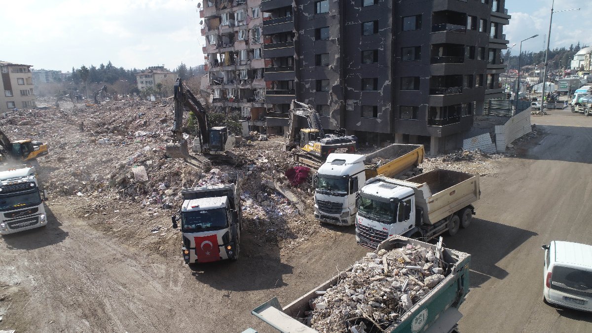 Kentin farklı bölgelerinde yıkılan veya ağır hasar sonrası yıkım kararı verilen binalardan kalan molozları toplama çalışmaları sürdürülüyor.