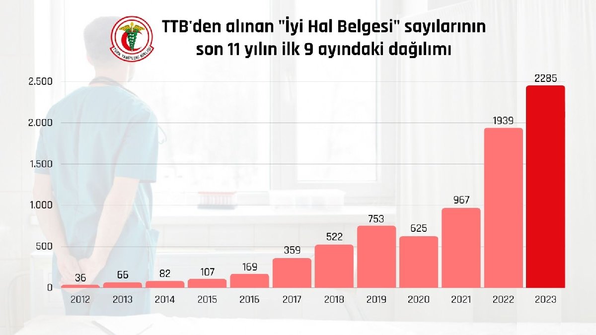 TTB verilerine göre 2023 yılında 'İyi Hal Belgesi' alanların yüzde 40’ını uzman, geri kalanlarının ise pratisyen hekimler oluşturdu. Yurt dışına en fazla giden branşlar ise şöyle sıralandı: Tıbbi pataloji, tıbbi biyokimya, beyin ve sinir cerrahisi, göğüs hastalıkları, adli tıp, iç hastalıkları, kadın hastalıkları, nöroloji, fizyoloji ve genel cerrahi.
