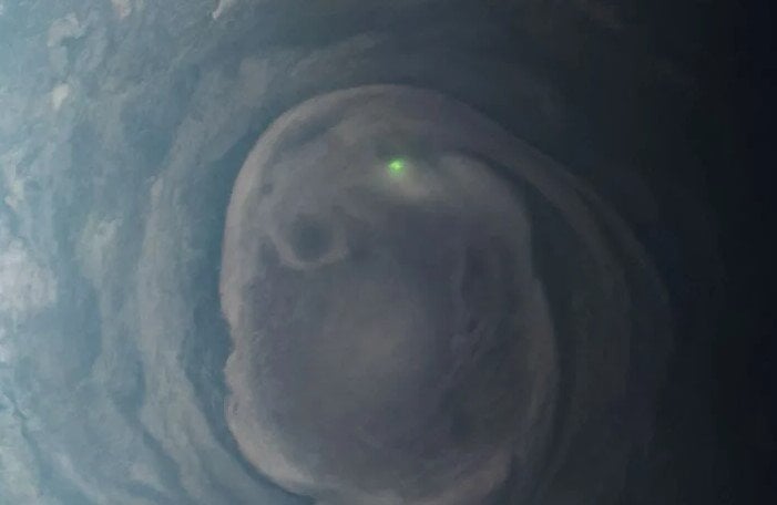 Fotoğrafta görülen yeşil küre; Juno, gezegenin bulut tepelerinin sadece 30.900 mil yukarısındayken çekildi. Daha önce de Voyager 1, 1979'da gezegendeki benzer şimşek çakmalarını yakalamıştı. Bu şimşeklerin Dünya'daki şimşeklerden 10 kat daha güçlü olduğu tahmin ediliyordu.