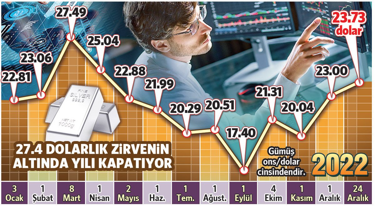 Güçlü dolar teması yıl boyunca altın ve gümüşte beklenen atağın önüne geçti. Gümüş riskli varlıklara talebin bir miktar artmasıyla bu ay yeniden 24 dolar seviyelerine atak yaptı fakat yılı 8 Mart’ta ulaştığı 27.49 dolarlık zirvenin gerisinde kapatmaya hazırlanıyor. Ancak birçok emtia analisti gümüşten umudu kesmiyor. 2022’de beklenen yükseliş eğiliminin 2023’te gerçekleşeceği öngörülüyor.