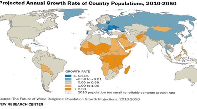 Dünya nüfusunun 2050 yılında 6,9 milyardan, 9,3 milyara çıkması beklenirken, en fazla nüfus artışı Müslümanlarda görülecek. 2010 yılında dünyada 2 milyar 168 milyon 330 bin Hristiyan yaşarken bu rakam 2050 yılında 2 milyar 918 milyon 70 bine çıkacak. Yine 2010 yılında dünyada 1 milyar 599 milyon 700 bin Müslüman yaşarken bu rakam 2050 yılında 2 milyar 761 milyon 480 bine çıkacak. Bu gelişmeler eşiğinde 2070 yılında ise Müslümanların sayısı Hristiyanları geçecek.
