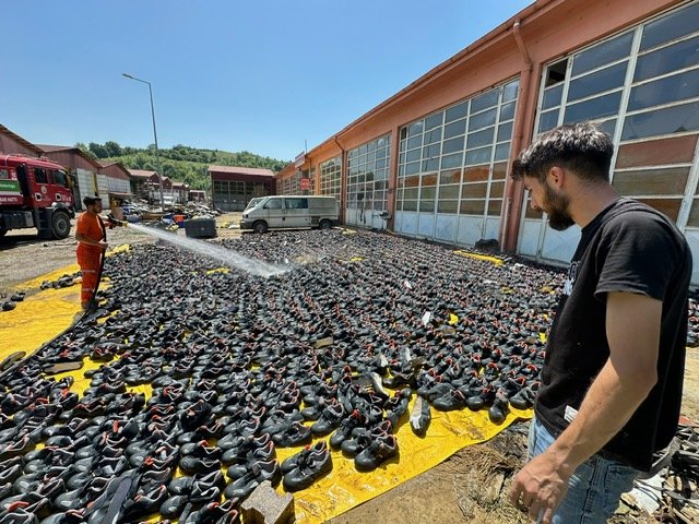 Selden en çok zararı gören ve 85 kişinin çalıştığı ayakkabı üretim atölyesinde de temizlik çalışmalarına başlandı. Sel nedeniyle atölyede üretilen 45 bin ayakkabı zarar gördü. Burada 22 bin ayakkabı, hortumlar ile yıkanarak güneşte kurumaya bırakıldı. Sorumlu Ahmet Can, "Ayakkabı üretim atölyemizdeki bütün ayakkabılar, su altında kaldı. Yaklaşık 45 bin ayakkabı sel sularına gitti. Şimdi kısım kısım ayakkabılarımızı kurutmaya çalışıyoruz. Hasarımız büyük" dedi.