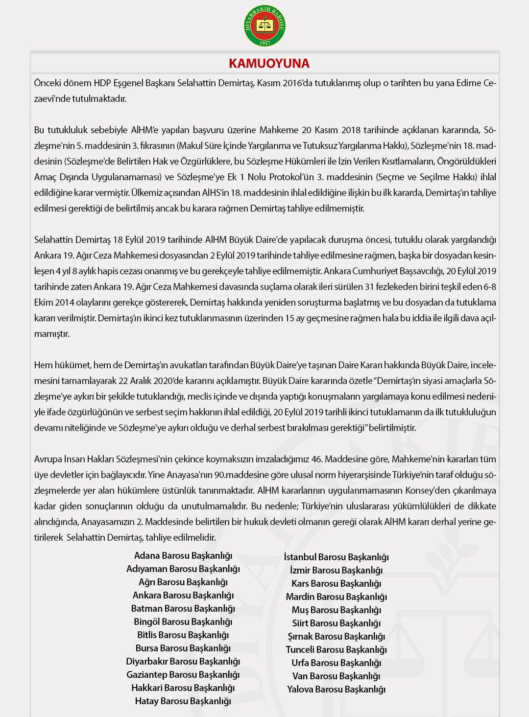 AİHM Büyük Dairesi’nin 22 Aralık’ta aldığı karara dikkat çekilen açıklamada, Türkiye’nin uluslararası yasalara uyması çağrısı yapıldı. Demirtaş’ın serbest bırakılmasını isteyen baroların açıklamasında, ”Önceki dönem HDP Eş genel Başkanı Selahattin Demirtaş, Kasım 2016’da tutuklanmış olup o tarihten bu yana Edirne Cezaevi'nde tutulmaktadır.