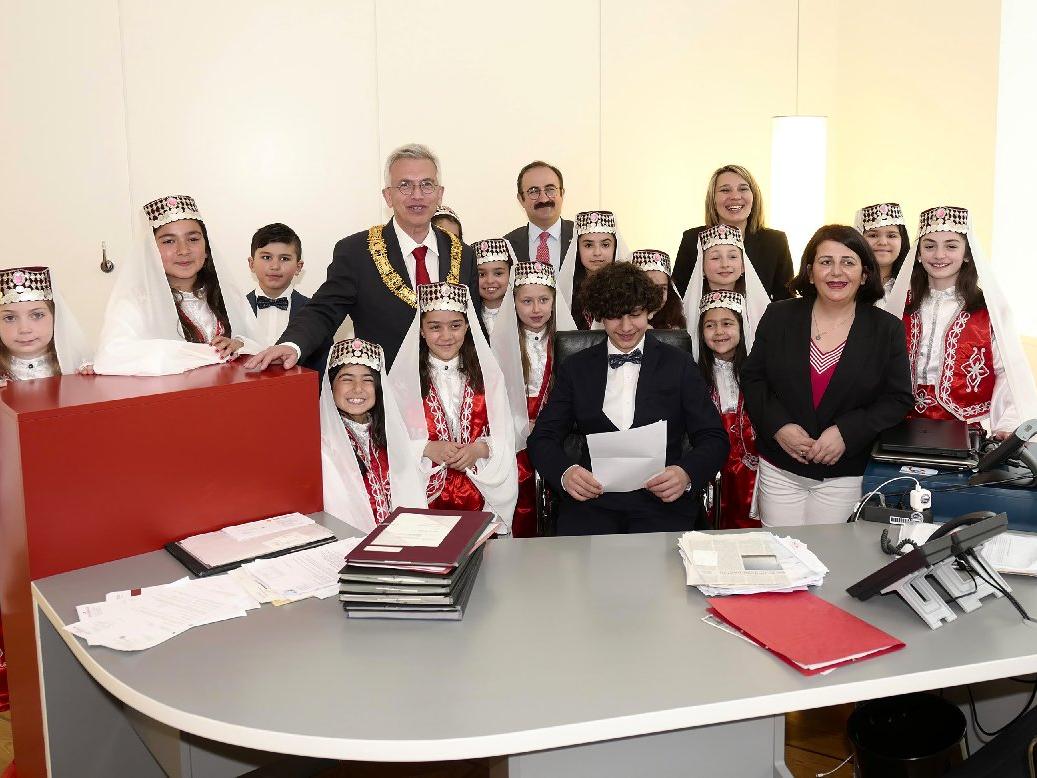 Çocuklar, Frankfurt Belediye Başkanı’nın koltuğuna geçerek birlikte poz verdi. Burada Georg-Büchner Okulu’ndan Emirhan Dönmez bir konuşma yaptı.