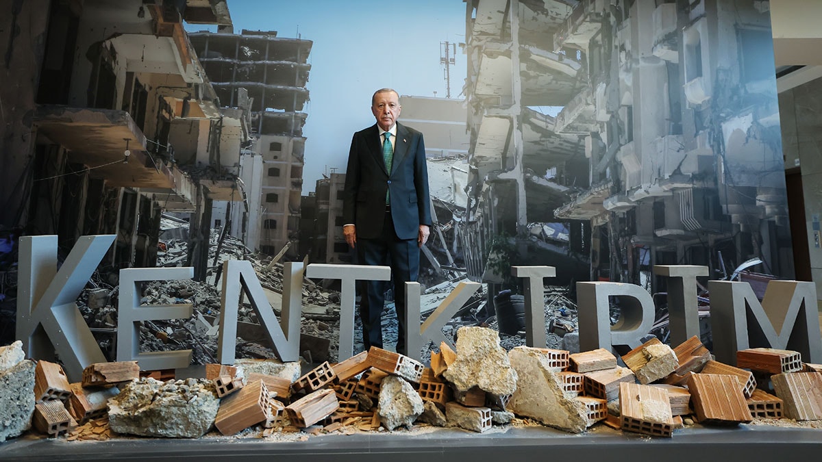 Cumhurbaşkanı Erdoğan, AKP Kongre Merkezi’nde düzenlenen Kentkırım Sergisi’nin açılışına katıldı. Erdoğan burada enkaz görüntüleri ve “Kentkırım” yazısı önünde poz verdi.