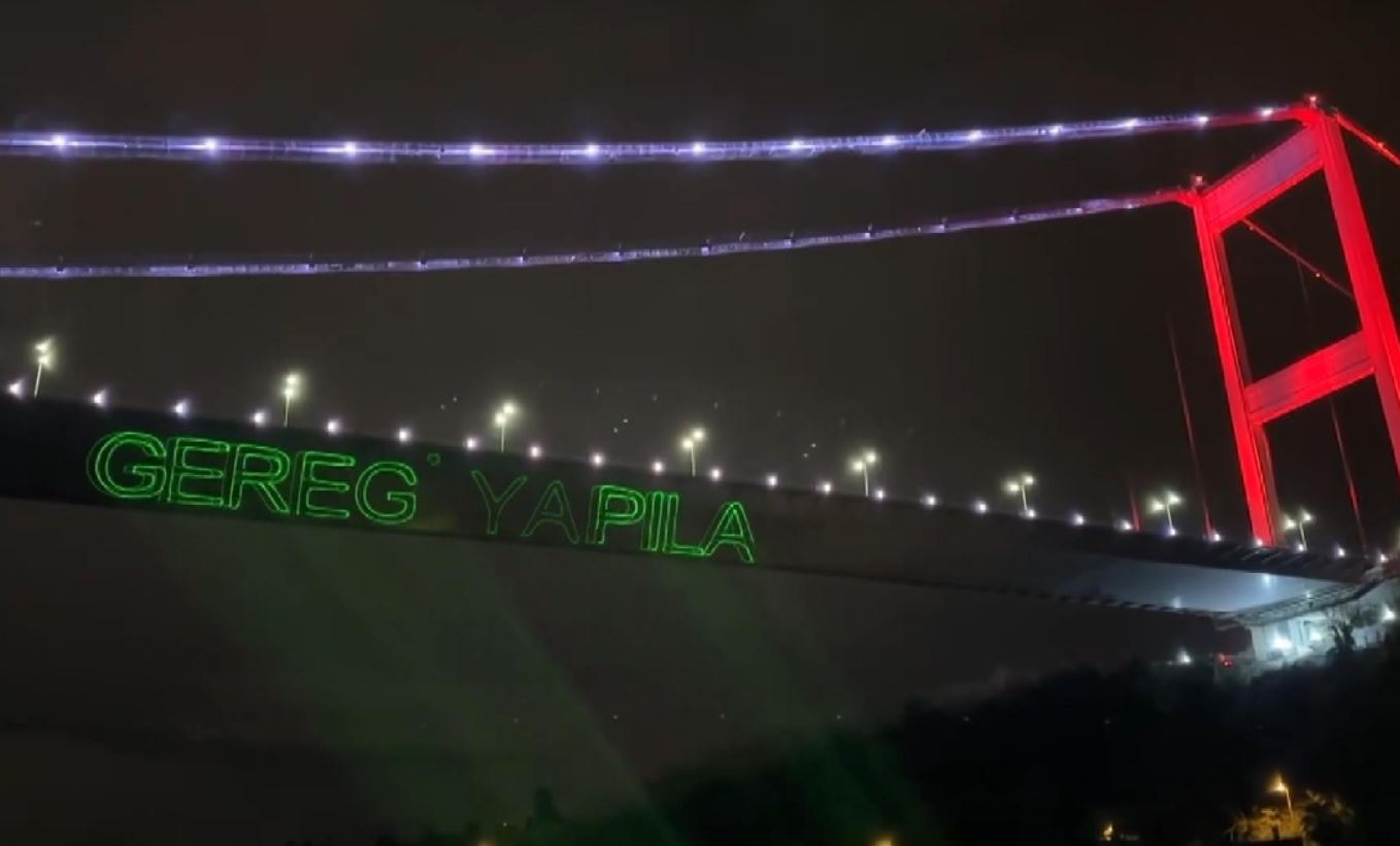 KÖPRÜYE LAZER IŞIKLI 'GEREĞİ YAPILACAKTIR' YAZISI