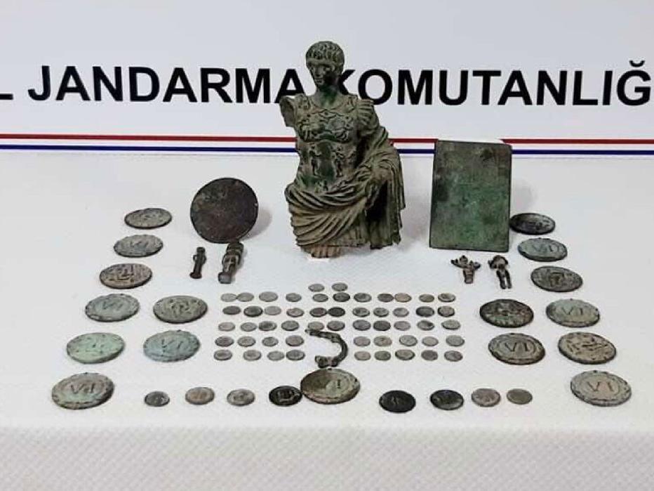 Ö.H. ve M.A'nın üzerinde 1 milyon liraya satmaya çalıştıkları, çeşitli ülkelere ait 61 madeni para, çeşitli ebat ve figürlerde 24 obje ile bir heykel bulundu.