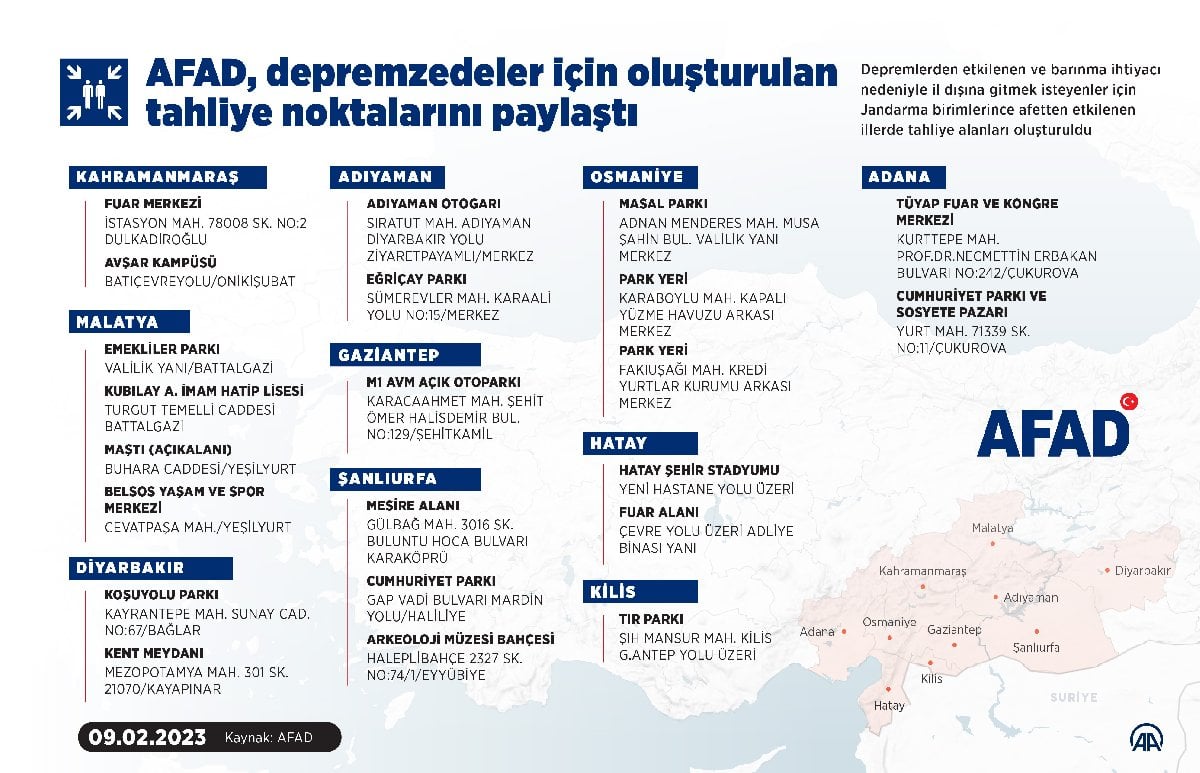 - Tahliye olan vatandaşlarımız, gidecekleri illerdeki valilikler ve AFAD koordinasyonunda belirlenen barınma alanlarına ve misafirhanelere yerleştirilmektedir. Kendi imkanlarıyla ulaşım sağlayıp afet bölgesinden ayrılmak isteyen vatandaşlarımız, çıkış yapmadan önce bulundukları yerlerdeki jandarma tahliye noktalarına bildirim yapmaları halinde, gidecekleri illerdeki barınma noktalarına yönlendirmeler yapılmaktadır.