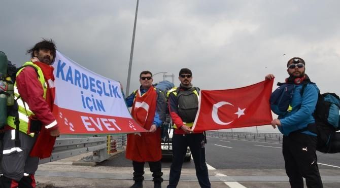 23 Şubat tarihinde Ankara'dan yürüyen 3 arkadaş Eskişehir, Bilecik, ardından Bursa'ya ulaştı. Geri dönüş yoluna çıkan 3 arkadaş bu kez Yalova, İstanbul, Kocaeli, Sakarya, Düzce ve Bolu güzergahını takip ederek 1071 kilometrelik yolu tamamlayarak Ankara'ya ulaşmayı hedefliyor. 3 arkadaşa Bursa ile Yalova güzergahında bir kişi daha eşlik ederken, 4 kişi bugün yürüyerek Osmangazi Köprüsü'nden geçti. 4 kişi "Kardeşliğe Evet Yürüyüşü" ve 'Kardeşlik İçin Evet' yazılı pankartlar ve Türk bayrağı taşıdı.
