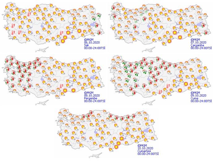 Meteoroloji Genel Müdürlüğü tarafından yapılan son değerlendirmelere göre Ülkemizin doğu kesimlerinin parçalı, yer yer çok bulutlu, Kars, Iğdır, Ağrı, Van ve Hakkari çevrelerinin yerel olmak üzere sağanak ve gök gürültülü sağanak yağışlı, diğer yerlerin az bulutlu ve açık geçeceği tahmin ediliyor. Ülkemizin batı kesimlerinde Kuzey Afrika kaynaklı toz taşınımı görülmesi beklenmekte.