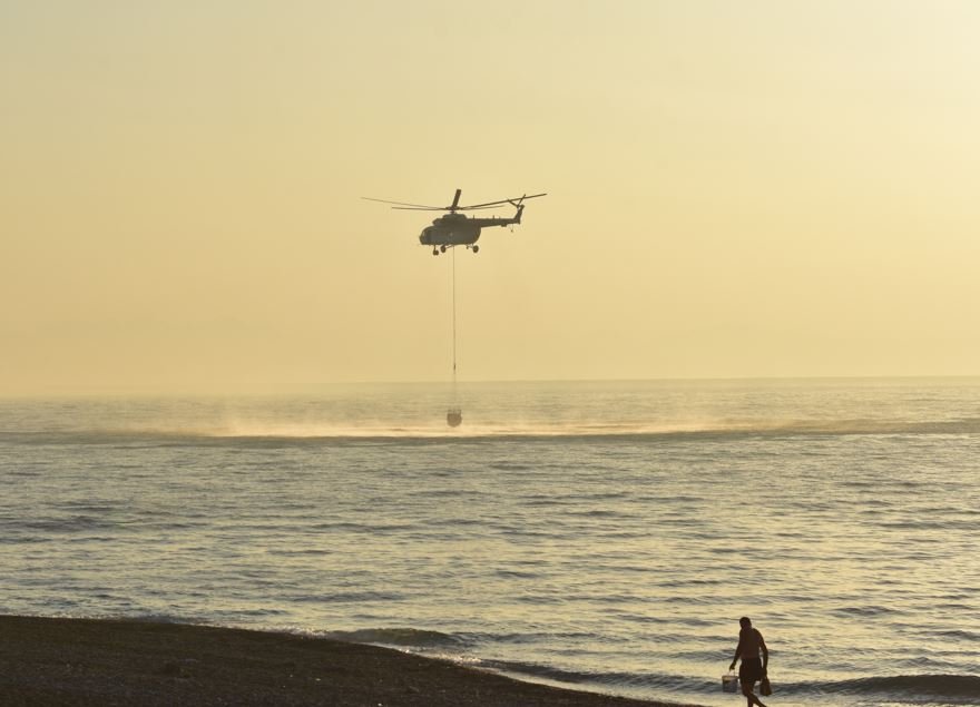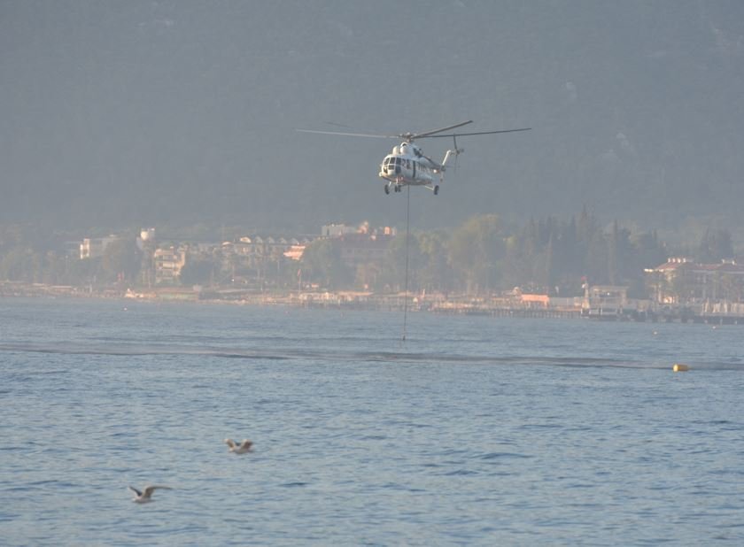 Bölgede çalışan helikopterler, alçalarak denizden aldıkları suyu, yanan alanlara taşıyarak söndürme çalışmalarına destek veriyor.