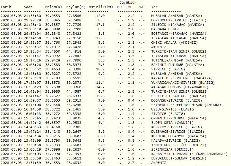 Kandilli Rasathanesi'nin son depremler listesine göre ülkemizde son deprem Manisa'nın Akhisar ilçesi Musalar köyünde 2,2 büyüklüğünde meydana geldi. Güncel son depremler listesi için aşağıdaki linkleri takip edebilirsiniz.