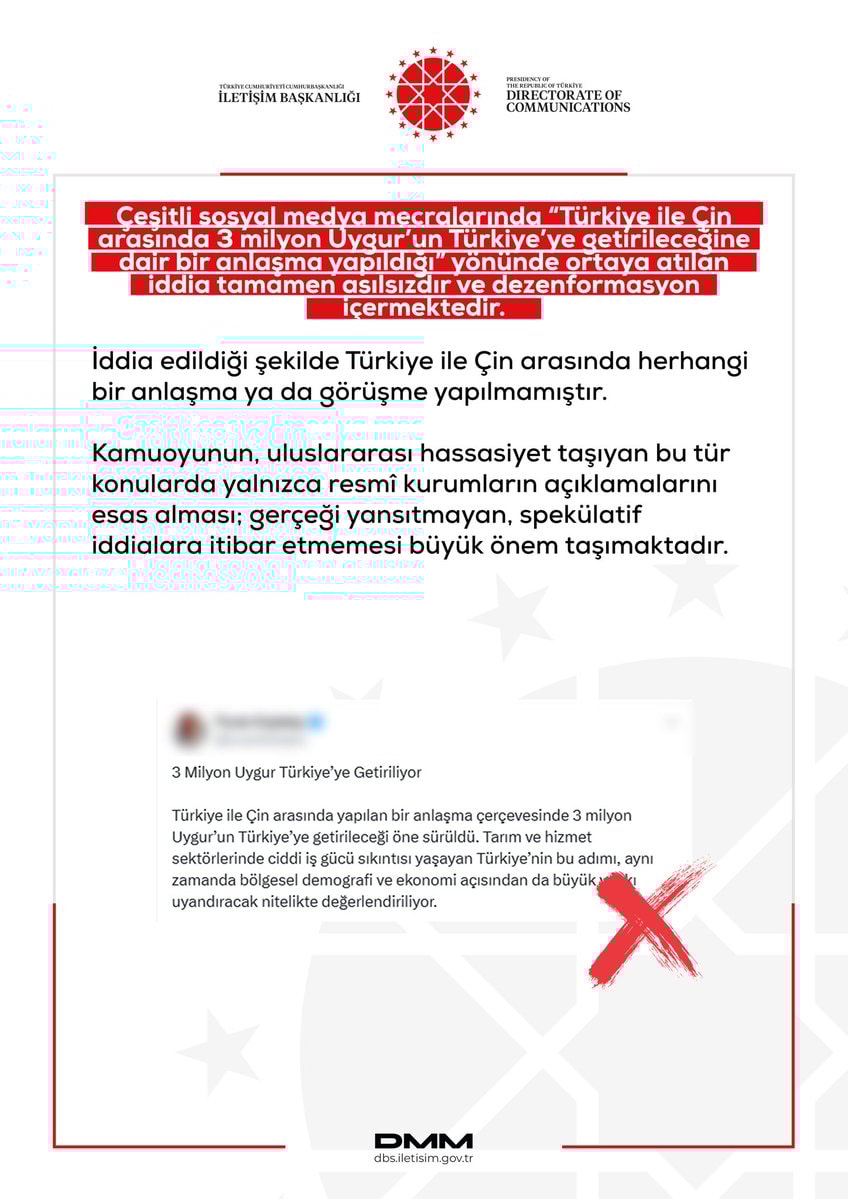 "Çeşitli sosyal medya mecralarında “Türkiye ile Çin arasında 3 milyon Uygur’un Türkiye’ye getirileceğine dair bir anlaşma yapıldığı” yönünde ortaya atılan iddia tamamen asılsızdır ve dezenformasyon içermektedir.