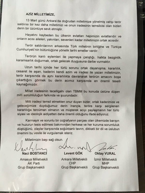 Milli iradeyi temsil etmekten onur duyan bizler, ortak kaderimize ve geleceğimize duyduğumuz derin inançla teröre karşı sergilenen kararlılığa tercüman olmanın ve müşterek acıyı paylaşmanın her türlü siyasi ve ideolojik aidiyetten daha önemli olduğunu ifade ediyoruz.