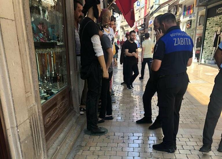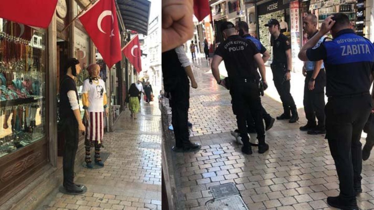 Her milli bayramda aynı şekilde cansız mankenleri dükkanının önüne koyan dükkan sahibi Kakışım, duruma itiraz edince zabıta ekipleri olay yerine polis çağırdı.