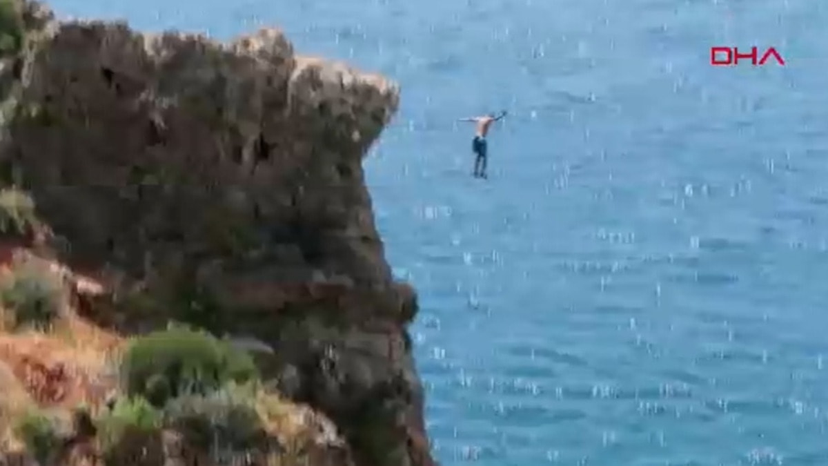 Antalya'nın Konyaaltı sahilinde, 30 metrelik falezlerin zirvesine çıkan bir genç, arkadaşlarının tezahüratları eşliğinde denize tehlikeli bir atlayış yaptı.