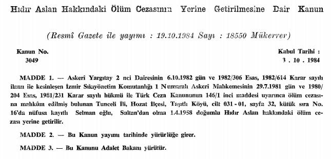 Ege Ordusu Askeri Mahkemesi 29 Temmuz 1981 günü Hıdır Aslan hakkında idam kararı verdi. Askeri Yargıtay onadı. Temyiz, itiraz vs. üç yıl sürdü, dosya TBMM’ye geldi.