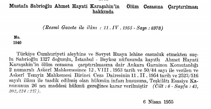 Hayati Karaşahin katıldığı her duruşmada casusluk yapmadığını söyledi.Hayati Karaşahin’in yargılanması ve temyiz süreci iki yıl sürdü. "Türkiye Cumhuriyeti aleyhine ve Sovyet Rusya lehine casusluk etmekten" suçlu bulundu, idama mahkûm edildi, dosya TBMM’ye gönderildi.