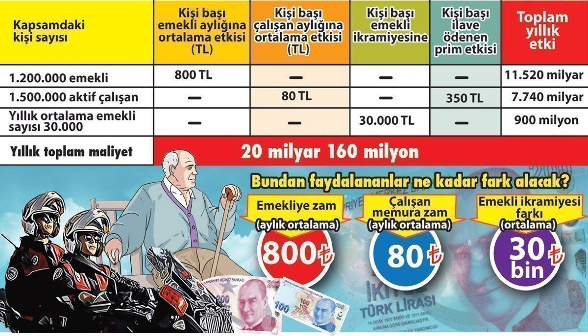 2 milyonu aşkın memur emeklisinin yarısı da ek gösterge kapsamında olup, özellikle emekli aylığı artışı yönü ile 2.5 milyon kişiyi etkileyecek gibi görünüyor ve her yıl bu etki görülecek. Ek gösterge, ortalama bir kişide 800 TL emekli aylığı artışı demektir. Fakat 15.10.2008 sonrası memuriyete girenleri çok az etkileyecek. Toplam maliyet ise yıllık 20 milyarı bulmakla birlikte; tüm memurların kapsama alınması halinde bu tutar yıllık en az 35 milyar lirayı bulacaktır.