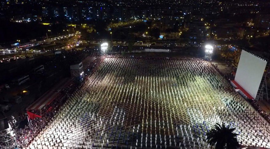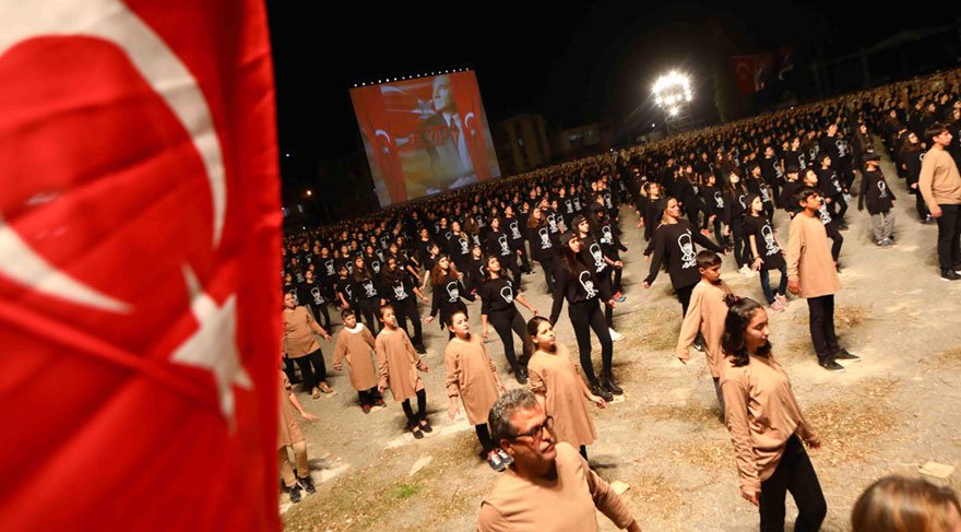 Bayraklı Belediye Başkanı Hasan Karabağ etkinlikte yaptığı konuşmada, "Dünyada bir ilki gerçekleştirdiniz. Sizi kutluyorum. Geçen sene de bir ilki gerçekleştirdik, bu sene de aynı şeyi yaptınız. Bugün burada sevgili Atatürk´ü renkli kalpaklı resmini 4 bin insanımız gövdesini koyarak yaptı. Aslında bu toprağa bu gövdeler konurken sadece vücudunuzu değil, kalbimizdeki Atatürk sevgisini, Cumhuriyet sevgisini, vatanımızı, bayrağımızı koydunuz" diye konuştu. Karabağ'ın konuşmasının ardından hep bir ağızdan 10. Yıl Marşı okundu. (DHA)