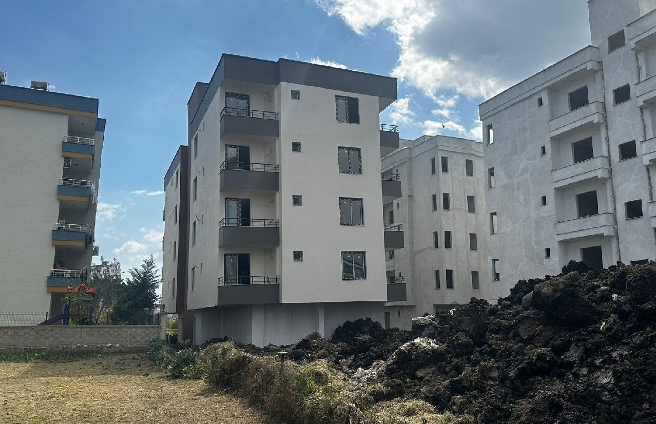 Mersin'in Erdemli ilçesi Akdeniz Mahallesi Muhammet Çavuş Sokak'ta inşaat alanında yapımı tamamlanan 4 katlı bina, yan yatmaya başladı.