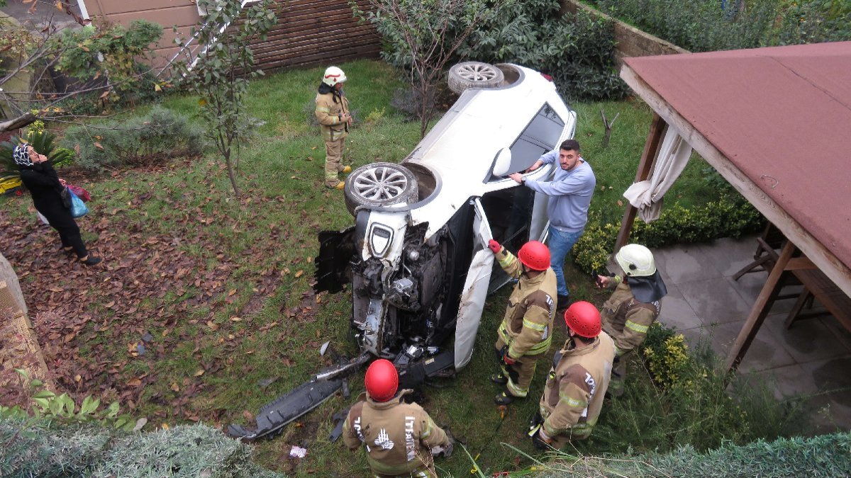 Otomobil bir evin duvarındaki demir korkulukları aşarak yaklaşık 4 metre yükseklikten bahçeye düştü. İhbar üzerine olay yerine polis, itfaiye ve sağlık ekipleri sevk edildi.