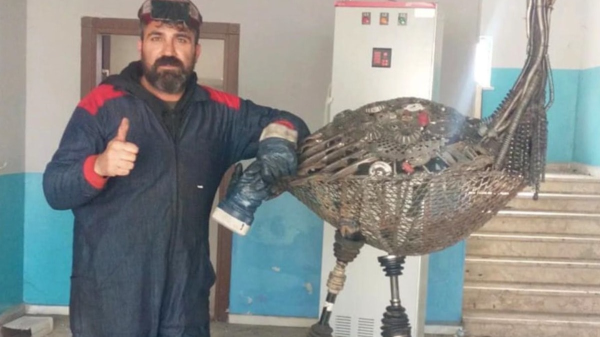 Sanayi sitesi ve hurdacılardan topladığı bilye, zincir, çivi, yay, amortisör, vida, balata, buji gibi atıkları heykele dönüştüren öğretmen, çevresinden de destek gördü.