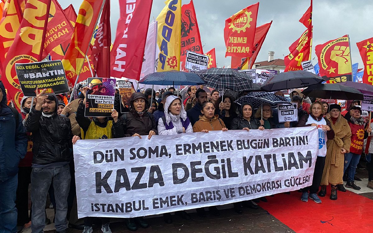 * Açlık, işsizlik, hayat pahalılığı, sömürü ile her anımızı cehenneme çevirenler, itiraz edenleri, eleştirenleri, karşı çıkanları baskı ve şiddet ile bastırmaya çalışanlar bu katliamın sorumlusudur. Şimdi bir kez daha, Soma’daki ve çalışırken ölen yüzlerce işçinin ahı yerde dururken, Amasra’ya giderek gösteri yapan, gerçek yüzlerini gizleyen, her zamanki maskelerini takan, fıtrat demagojileri yapanlar emekçileri kandırmaya çalışıyorlar. 41 madenci kardeşimizin canına mal olmuş bu ihmali örtmek için dezenformasyon yapmakla meşguller. Patlamanın nedeni konusunda tıpkı Soma’da yaşandığı gibi “trafo patlaması” yalanının ifade edilmiş olmasını, gerçeğin örtülmeye çalışılmasını, aynı filmi izlemeyi kabul etmiyoruz.