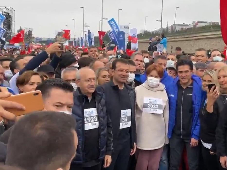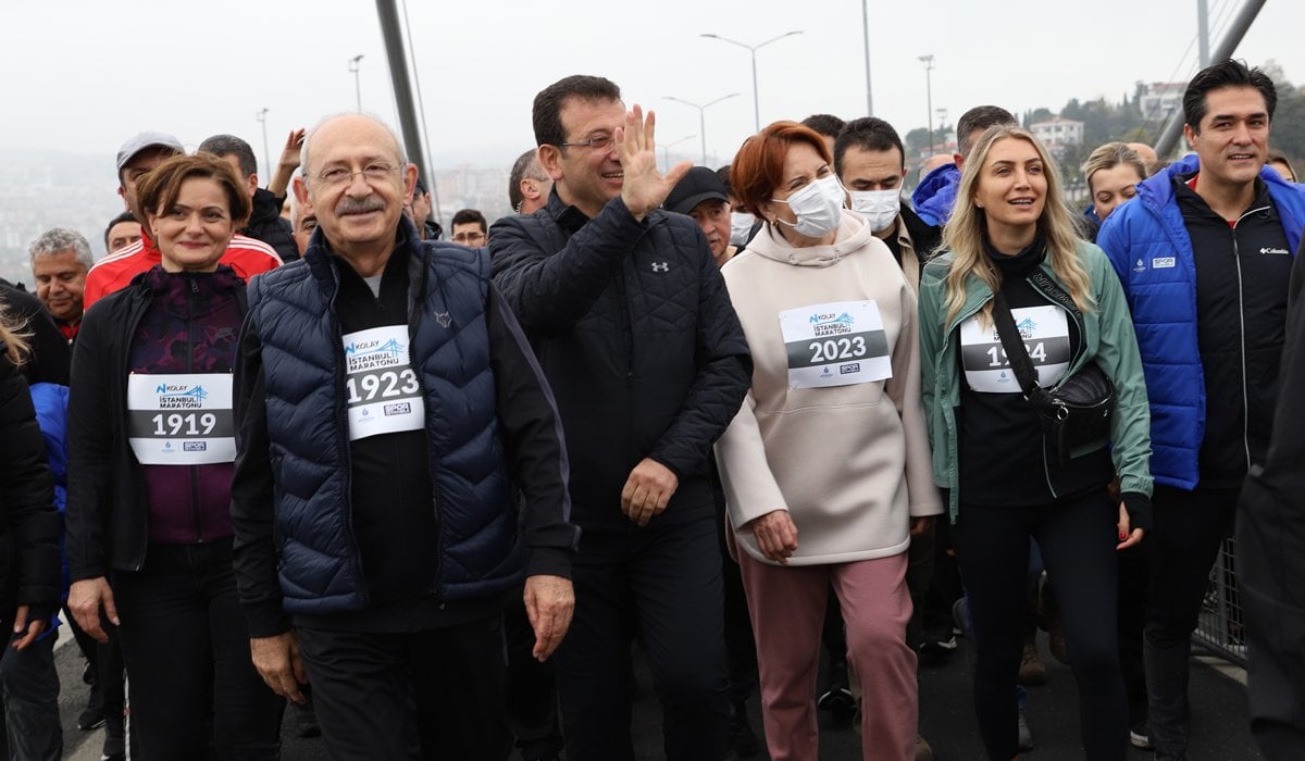 Burada 8 kilometrelik halk koşunu başlatan heyet, vatandaşlarla birlikte 15 Temmuz Şehitler Köprüsü çıkışına kadar yürüdü. Maratona CHP lideri Kılıçdaroğlu "1923", İYİ Parti Genel Başkanı Akşener "2023", İstanbul Büyükşehir Belediye Başkanı Ekrem İmamoğlu "34", CHP İstanbul İl Başkanı Canan Kaftancıoğlu "1919" göğüs numarasıyla katıldı.