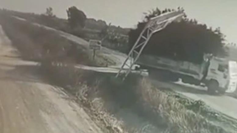 Kamyon şoförü ana yola dönüş yaparken, odunlara takılan tabela da 90 derece açıyla ana yola döndü. Durumu fark eden kamyon şoförü geri manevra yaparak tabelanın dengede kalmasını sağladıktan sonra yoluna devam etti.
