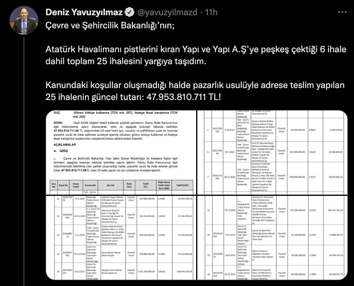 *Atatürk Havalimanı pistlerini kıran Yapı ve Yapı A.Ş’ye peşkeş çektiği 6 ihale dahil toplam 25 ihalesini yargıya taşıdım. Kanundaki koşullar oluşmadığı halde pazarlık usulüyle adrese teslim yapılan 25 ihalenin güncel tutarı: 47.953.810.711 TL