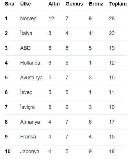 Olimpiyatların 10. günü sonunda Norveç; 12 altın, 7 gümüş ve 9 bronz madalya ile rakipleriyle arasındaki farkı açtı.