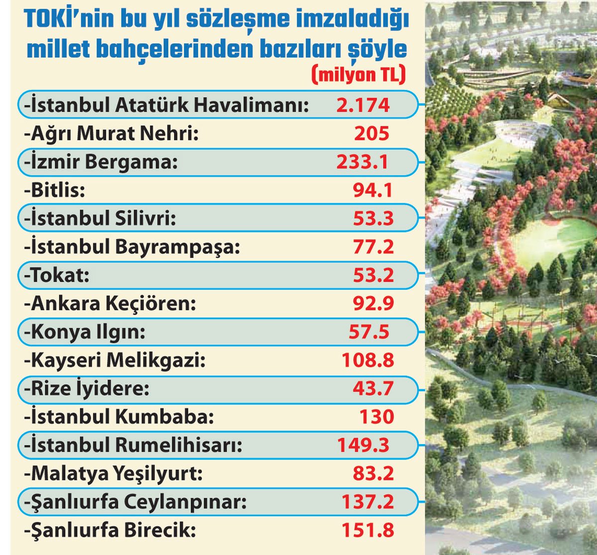 TOKİ İzmir’in Bergama ilçesine yapılacak Millet Bahçesi için de tamamlama ihalesine çıktı. Millet bahçesinin yapımı 65 milyon 999 bin TL’ye mal olurken, TOKİ 10 Ağustos 2022’de 167 milyon 167 bin TL’lik yeni bir sözleşme imzaladı. Maliyet, 233 milyon 166 bin TL’ye yükseldi. İstanbul Beykoz Millet Bahçesi için 61 milyon 161 bin TL’lik, Manisa Şehzadeler Millet Bahçesi için de 143 milyon 143 bin TL’lik sözleşme yapıldı.