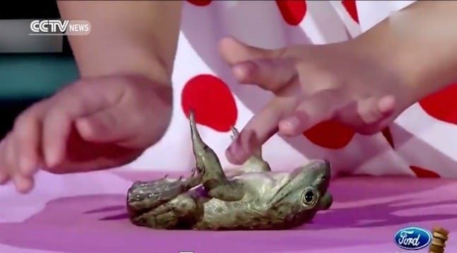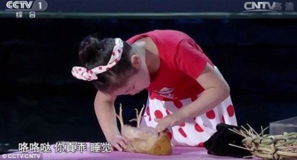 İzleyenler kadar jüri üyelerini de kendine hayran bırakan 5 yaşındaki Han Jiaying, performansının ortasında uykudan uyanan köpek ve kurbağayı da nazik hareketleriyle takrar uyutmayı başarıyor.