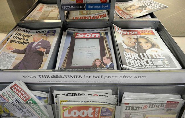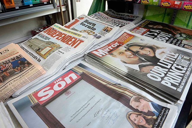 Doğum olayını manşetlere taşıyan gazeteler de iç sayfalarda da bu habere çok büyük yer ayırdı. Times manşetinde 'Bir Prens doğdu' derken, Guardian, 'Bir doğum, bir erkek bebek, bir prens, bir kral' ifadelerine yer verirken Independent, 'Özel doğum, Düşes bir erkek bebek doğurdu ve küresel medya çılgınlığı başladı' dedi. Daily Telegraph ise 'Bebek erkek' manşetini attı.
