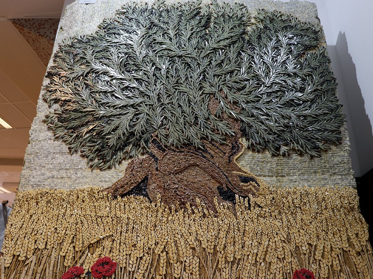 Taşları tek tek yontarak birleştiren Hüzmeli, 9 aylık çalışmayla barışın simgesi olarak bilinen zeytin ağacının buğday tarlasında yansıtıldığı 3 boyutlu mozaik tasarladı.