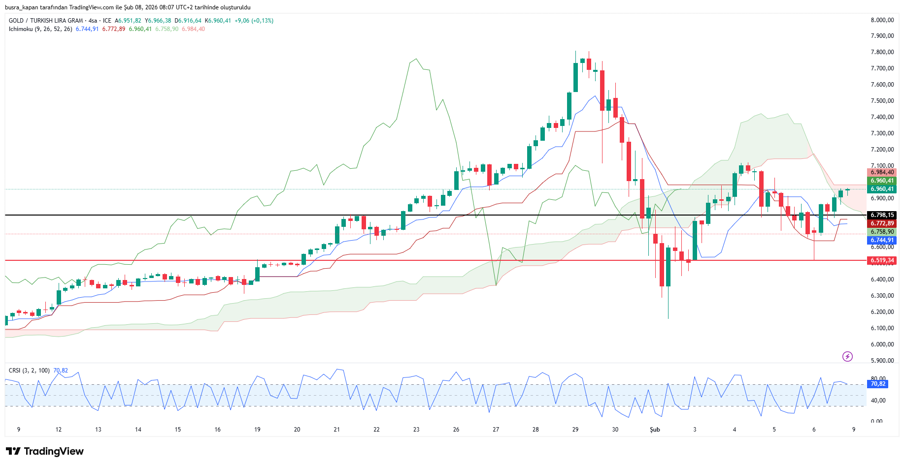 Ons altındaki toparlanmalar ve dolar/TL kurundaki yükselişin etkisiyle gram altında yön yeniden yukarı oldu. Haftanın son gününde gece yarısı 6 bin 500 liraya kadar gerileyen gram altın, haftayı 6 bin 960 liradan kapatarak 7 bin liraya dayandı.