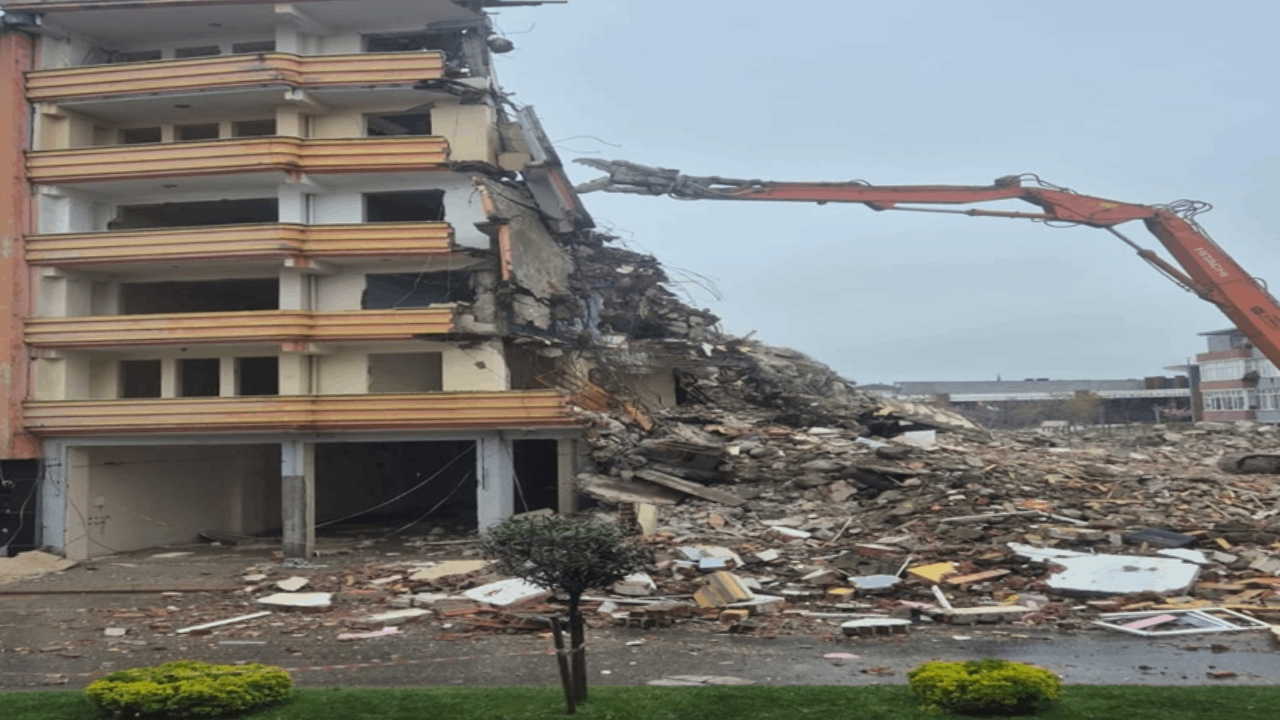 Karasu İlçesi Plaj Caddesi’nde devam eden kentsel dönüşüm kapsamında 6 katlı bir binanın yıkımı için çalışma başlatıldı. Yıkım sırasında bina, iş makinesinin üzerine devrildi. Hasar gören iş makinesinin operatörü Kemal Yıldırım, şans eseri kazayı yara almadan atlattı. Yaşananlar, cep telefonuyla kayda alındı.