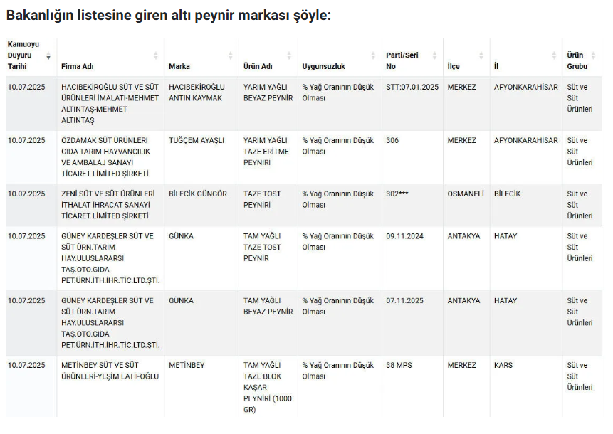 Söz konusu ürünlerin peynir ambalajlarında yer alan bilgilerle içeriklerinin örtüşmediği bildirildi.