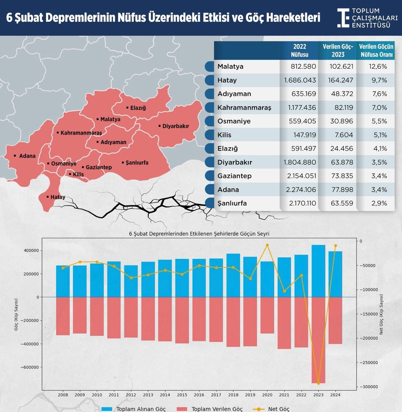 Deprem bölgesi 2023 yılında toplamda 293 bin 121 kişi net göç vererek tarihi bir kayıp yaşadı. Önceki yılların ortalaması yıllık 55 bin 970 kişi olarak kaydedilirken, felaketle birlikte bu rakamın 5 kattan fazla artması dikkat çekti.