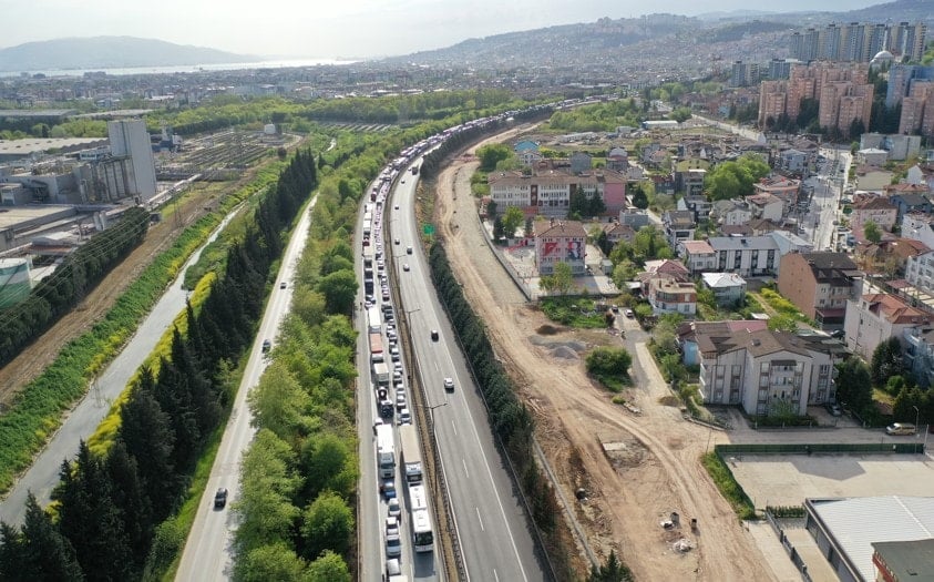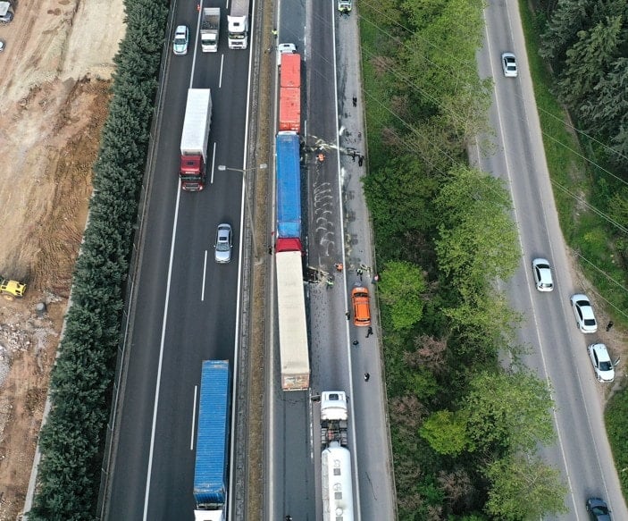 Öte yandan kazanın yol açtığı yoğun trafik dronla görüntülenirken, oluşan araç kuyruğunun kilometrelerce uzadığı görüldü.