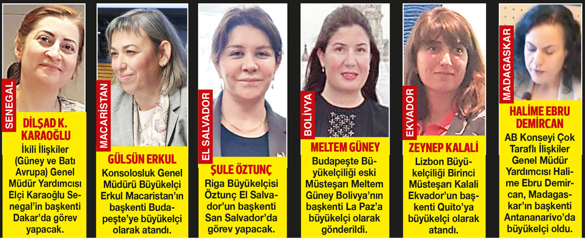 Dışişleri Bakanı Hakan Fidan, Türkiye’nin bazı Büyükelçilikleri ve Daimi Temsilcilikleri için yeni görevlendirmeler yaptı ve 6 ülkeye de kadın Büyükelçi atandı. Macaristan, Senegal, Ekvador, El Salvador, Bolivya ve Madagaskar’da Türkiye’yi kadın Büyükelçiler temsil edecek. Dışişleri Bakanlığı bünyesinde uzun yıllar görev yapmış deneyimli isimler, yeni büyükelçilik görevlerine getirildi.