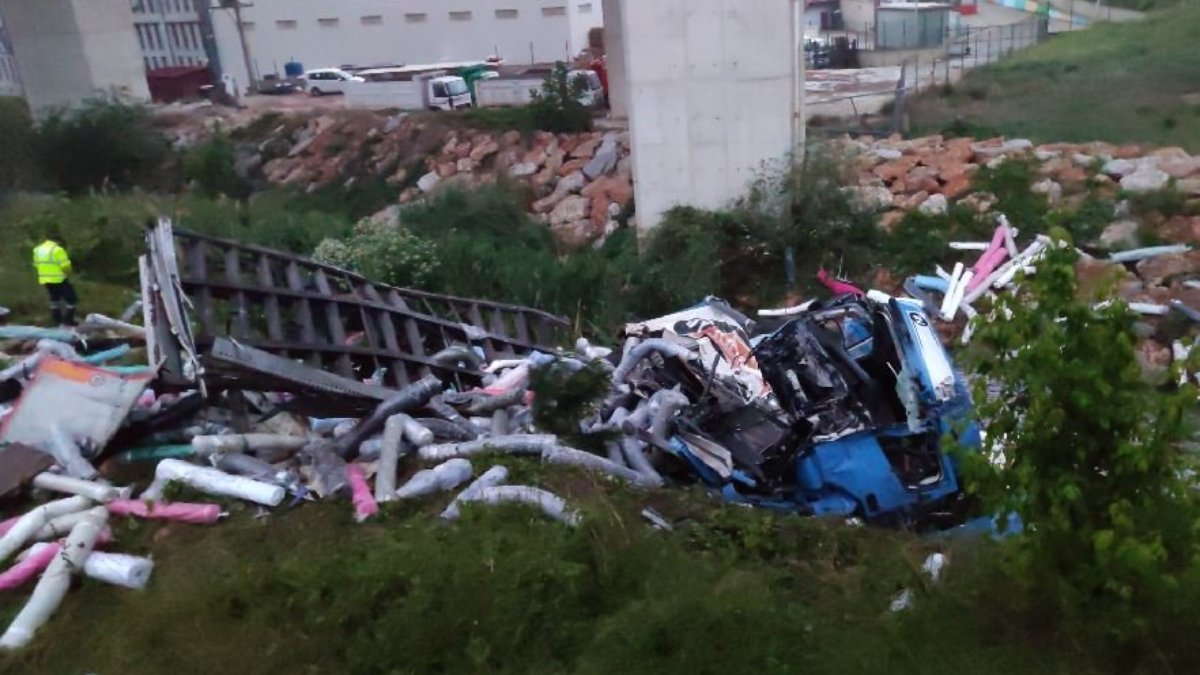 Savrularak yan yatan TIR metrelerce sürüklenerek bariyerlere çarptı. Bariyerleri parçalayarak 60 metrelik yükseklikten dere yatağına düşen TIR demir yığınına döndü.