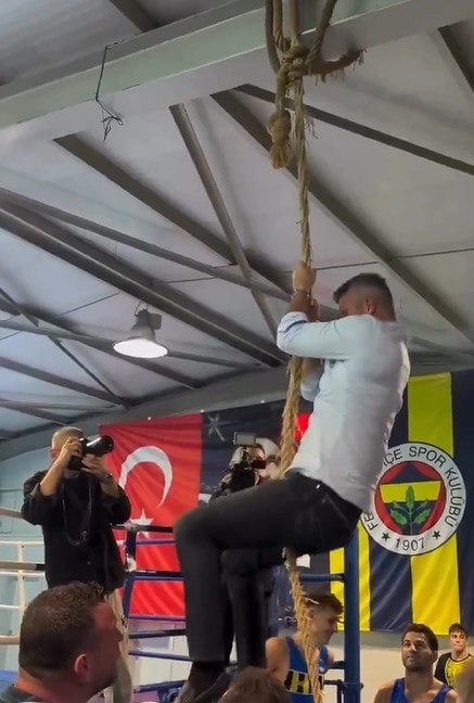 Genç sporcuların ve yöneticilerin şaşkın bakışları arasında sadece ellerini kullanarak halata tırmanan Sadettin Saran aynı şekilde geri indi.