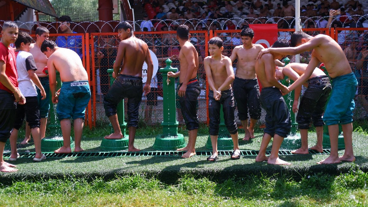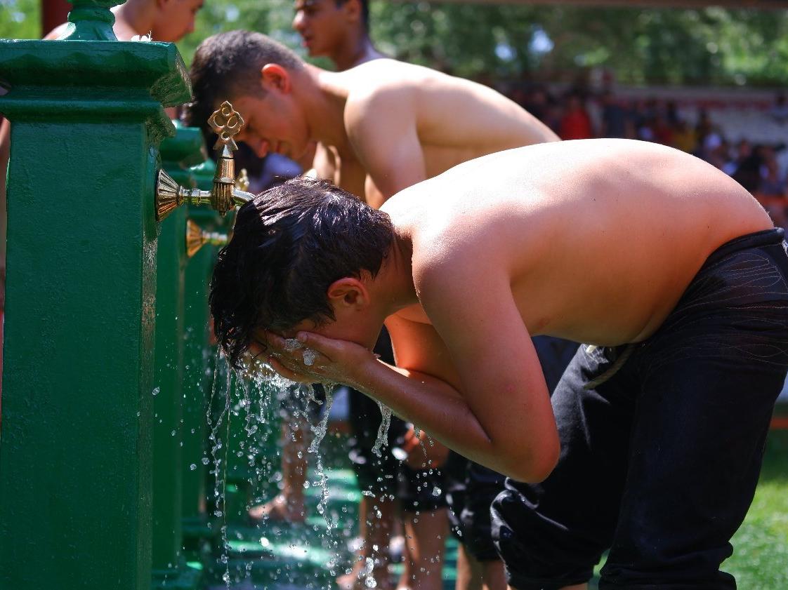 Müsabaka öncesi yağlanan pehlivanların hissettiği sıcaklık ise daha da artıyor. Güneşin altında dualı çayırda kıyasıya mücadele sergileyen pehlivanlar, müsabakanın ardından soluğu çeşme altlarında ve gölgelik alanlarda alıyor. Nefes nefese kalan pehlivanlar, çeşmenin altına girerek serinlemeye çalışıyor.