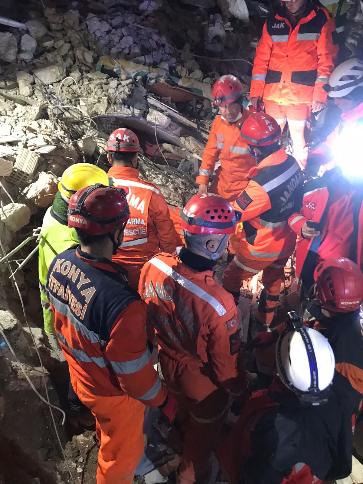 Konya Büyükşehir Belediyesi arama-kurtarma ekipleri, Antakya ilçesi Cebrail Mahallesi Sinan Sokaktaki Eser Apartmanı'nın enkazında yaşam belirtisi aldı.