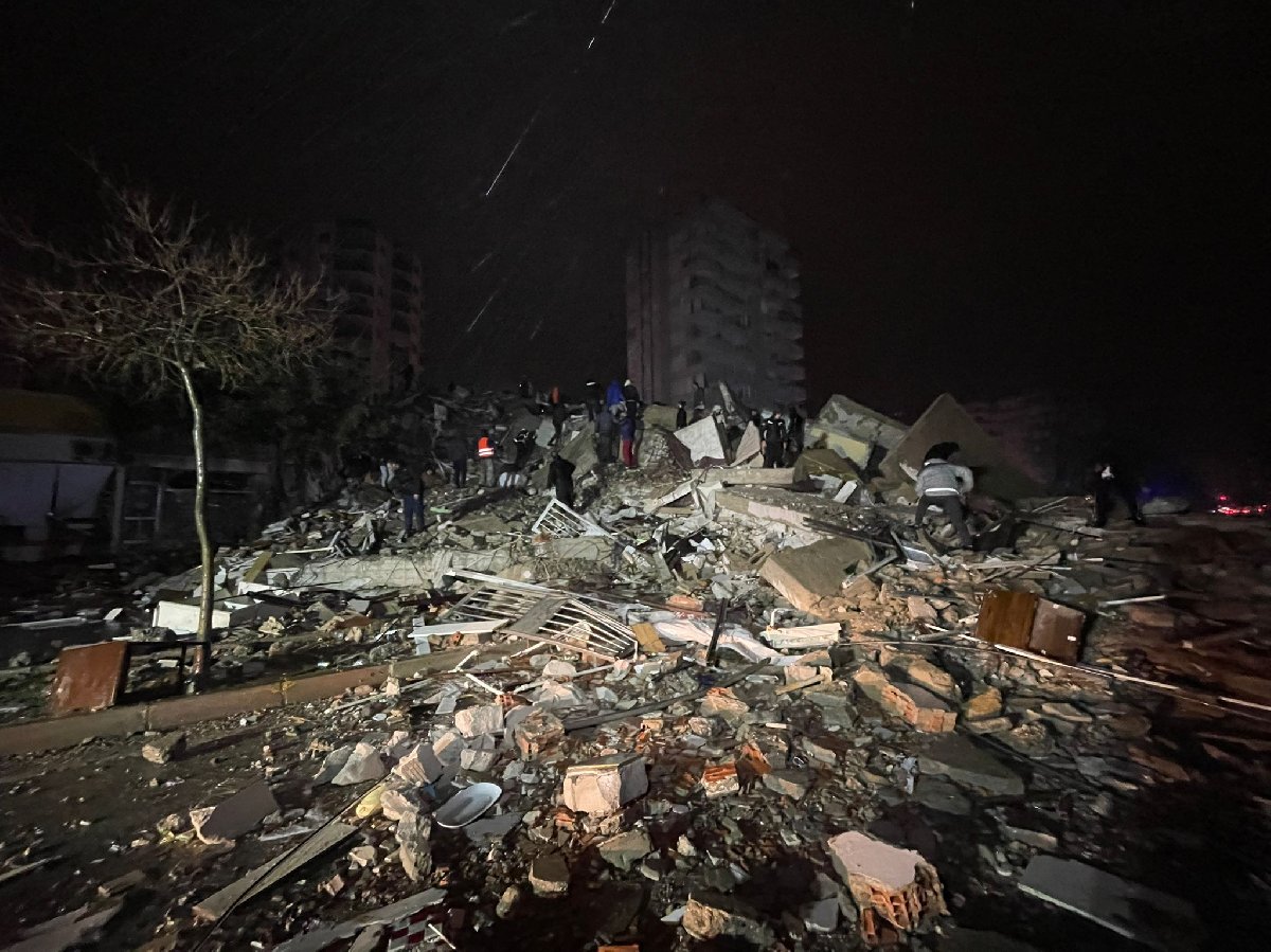 Osmaniye'de deprem nedeniyle Raufbey Mahallesinde yıkılan Metin Tamer sitesinde arama kurtarma çalışmaları devam ediyor. (AA)