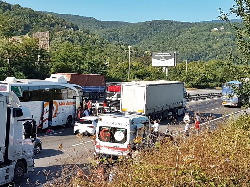 Kaza, sabah saatlerinde TEM Otoyolu Sapanca ilçesi Yeni Mahalle mevkisinde meydana geldi. İstanbul yönüne giden Abdülhamit Sarı (63) yönetimindeki 01 DKD 38 plakalı yolcu otobüsü, aynı yöne giden Veysi Demir yönetimindeki 34 JET 43 plakalı yolcu otobüsüne arkadan çarptı.